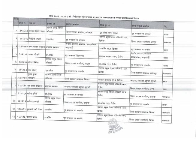 भक्तपुरको सहायक प्रमुख जिल्ला अधिकारीमा चिरञ्जीवी भण्डारी, ललितपुरको सहायक प्रजीअमा गीता घिमिरे र कारागार कार्यालय झुम्काको प्रमुखमा सुवास कुमार लामिछानेलाई सरुवा गरिएको छ ।