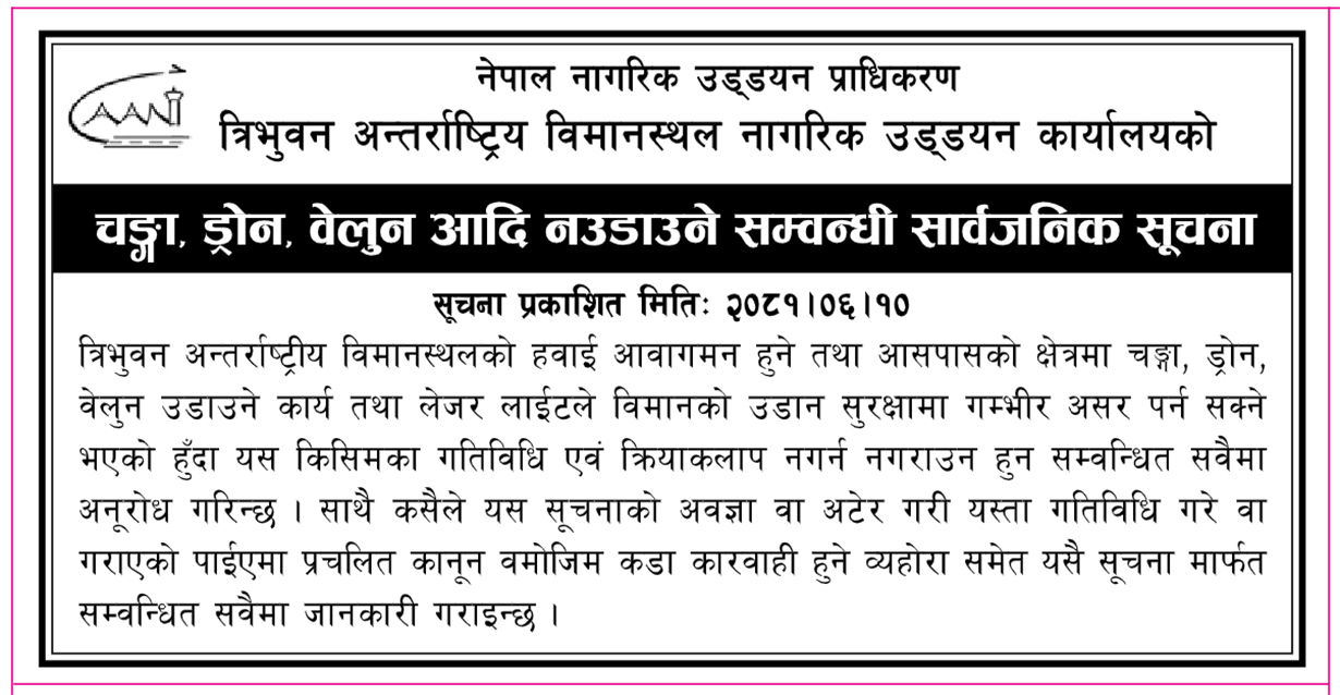 त्रिभुवन अन्तर्राष्ट्रिय विमानस्थल नागरिक उड्डयन कार्यालयले एक सूचना जारी गर्दै विमानको उडान सुरक्षामा गम्भीर असर पर्न सक्ने भएको हुँदा यस किसिमका गतिविधि एवं क्रियाकलाप नगर्न आग्रह गरेको हो ।