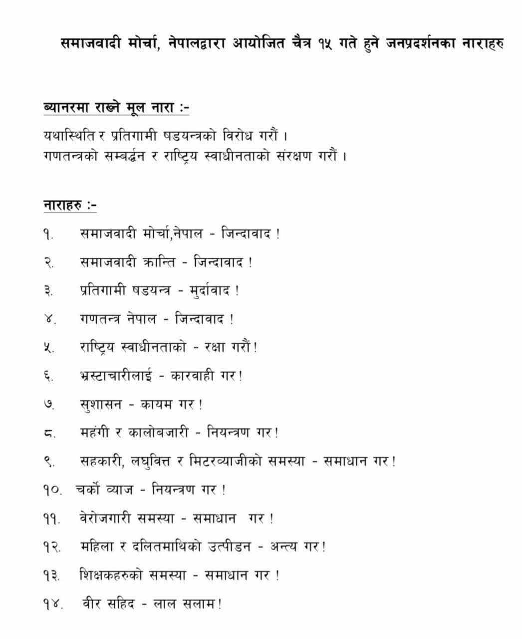 प्रदर्शनमा ‘समाजवादी मोर्चा, नेपाल जिन्दाबाद !’, ‘भ्रष्टाचारलाई कारबाही गर !’, ‘शिक्षकहरूको समस्या समाधान गर !’ जस्ता नारा प्रमुख रूपमा उठाइनेछन्। साथै, ‘प्रतिगामी षड्यन्त्र मुर्दावाद !’, ‘महँगी र कालोबजारी नियन्त्रण गर !’ जस्ता नाराहरूसमेत प्रदर्शनमा गुन्जाइने मोर्चाले जनाएको छ ।
