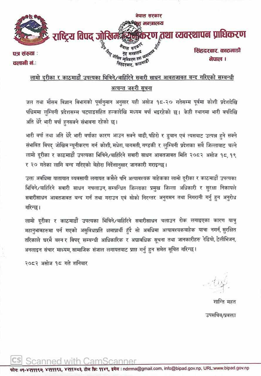 भारी वर्षा तथा अति धेरै भारी वर्षाका कारण आउन सक्ने बाढी, पहिरो र डुबान एवं त्यसबाट उत्पन्न हुने सक्ने सम्भावित विपद् जोखिम न्यूनीकरण गर्न कोशी, मधेस, बागमती, गण्डकी र लुम्बिनी प्रदेशका सबै जिल्लाबाट चल्ने लामो दूरीका र काठमाडौँ उपत्यका भित्रिने र बाहिरिने सवारी साधन आवतजावत मिति २०८२ असोज १८, १९ र २० गतेका लागि बन्द गरिएको बेहोरा निर्देशानुसार जानकारी गराइन्छ, प्राधिकरणले सूचना मार्फत भनेको छ ।