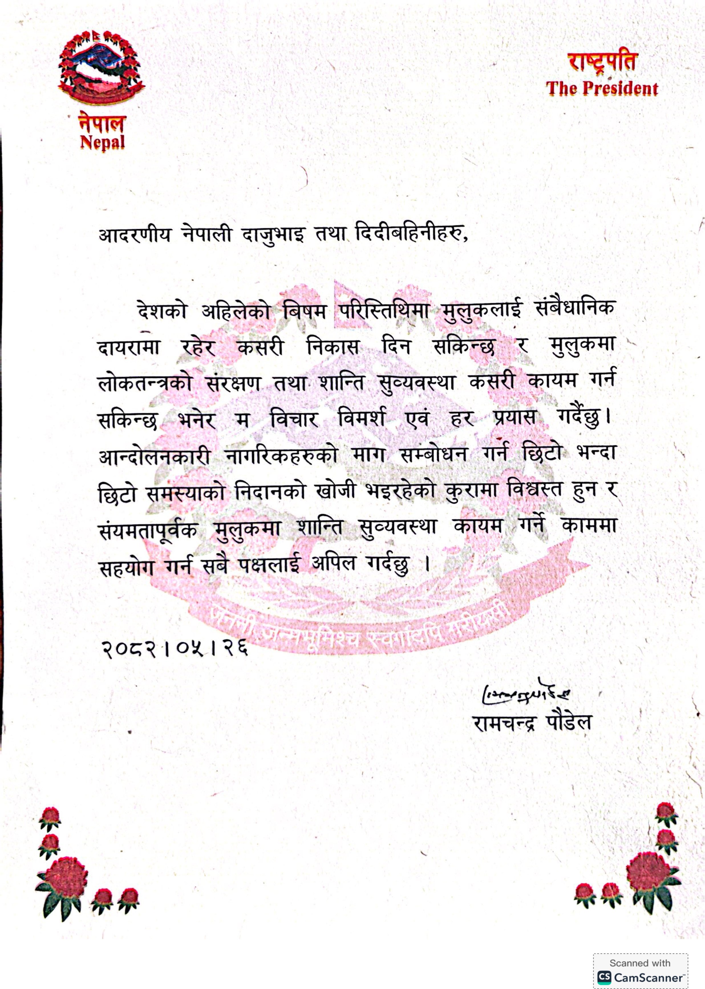 देशको अहिलेको बिषम परिस्तिथिमा मुलुकलाई संबैधानिक दायरामा रहेर कसरी निकास दिन सकिन्छ र मुलुकमा लोकतन्त्रको संरक्षण तथा शान्ति सुव्यवस्था कसरी कायम गर्न सकिन्छ भनेर म विचार विमर्श एवं हर प्रयास गर्दैछु । आन्दोलनकारी नागरिकहरुको माग सम्बोधन गर्न छिटो भन्दा छिटो समस्याको निदानको खोजी भइरहेको कुरामा विश्वस्त हुन र संयमतापूर्वक मुलुकमा शान्ति सुव्यवस्था कायम गर्ने काममा सहयोग गर्न सबै पक्षलाई अपिल गर्दछु ।