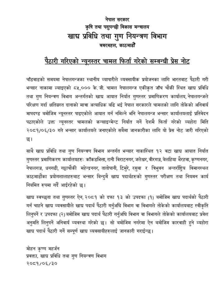 न्यून गुणस्तर पाइएपछि नेपालगञ्ज भन्सार कार्यालयलाई विभागले निर्यात गर्ने देशमै फिर्ता गरिदिन पत्र पठाएको थियो । सोही अनुसार भन्सार कार्यालयले चामल फिर्ता पठाइसकेको विभागका प्रवक्ता महर्जनले बताए ।