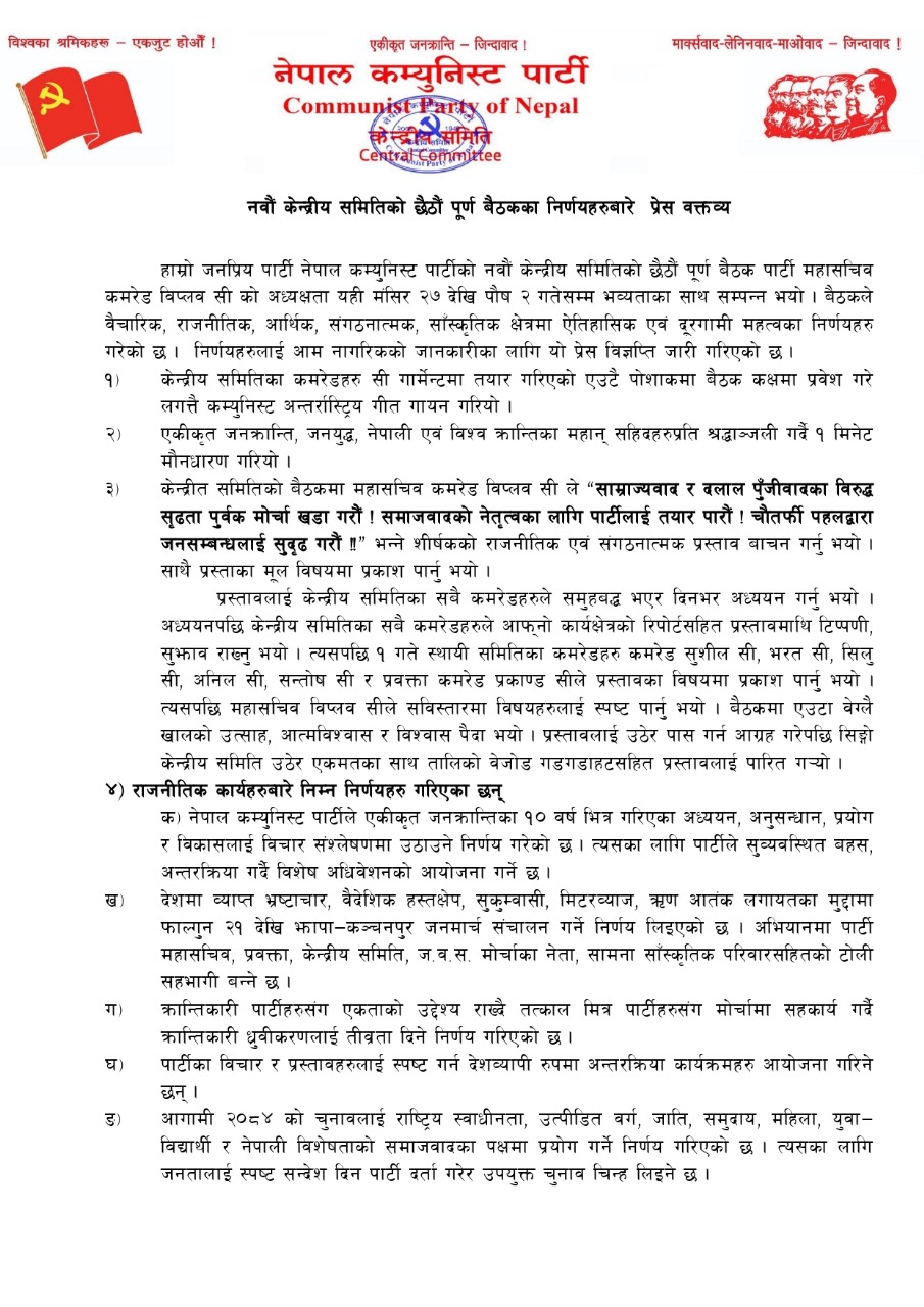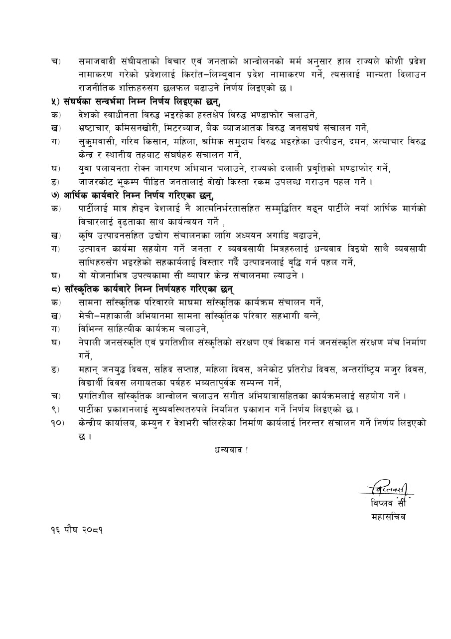 यस्तै आगामी २०८४ को चुनावलाई राष्ट्रिय स्वाधीनता, उत्पीडित वर्ग, जाति, समुदाय, महिला, युवा, विद्यार्थी र नेपाली विशेषताको समाजवादका पक्षमा प्रयोग गर्ने निर्णय गरिएको छ । त्यसका लागि जनतालाई स्पष्ट सन्देश दिन पार्टी दर्ता गरेर उपयुक्त चुनाव चिन्ह लिइने उल्लेख गरेको छ ।