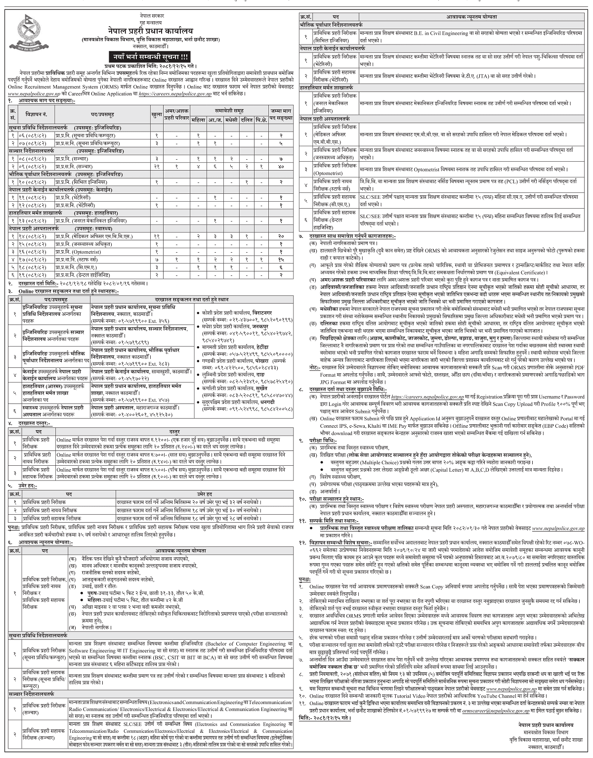 काठमाडौँ । नेपाल प्रहरीमा नयाँ भर्ना खुलेको छ । प्राविधिक प्रहरी समूह अन्तर्गत विभिन्न उपसमूहतर्फ रिक्त रहेका पदमा भर्ना खुला गरिएको हो ।