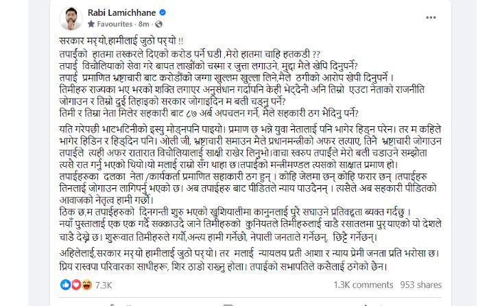 कास्की जिल्ला अदालतबाट पक्राउ पुर्जी जारी भएपछि सामाजिक सञ्जाल फेसबुकमा स्टाटस लेख्दै सरकार मरेर आफूलाई जुठो परेको बताएका हुन् ।